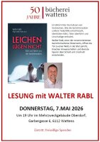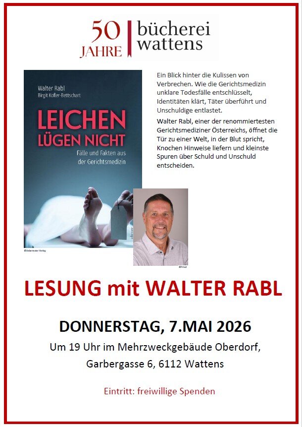 Die Bücherei lädt alle Krimibegeisterten zur Lesung mit dem renomierten Gerichtsmediziner Walter Rabl am Donnerstag, den 07. Mai 2026, um 19:00 Uhr in das Mehrzweckgebäude Oberdorf ein.