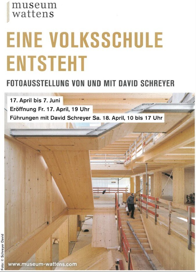 Architekturfotograf David Schreyer dokumentierte die Entstehung von Beginn an. Seine Fotoausstellung im Museum Wattens, nur wenige Meter vom Baufeld entfernt, zeigt, wie die neue Volksschule gewachsen ist.